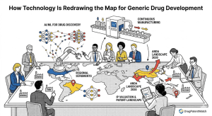 Drug discovery in the branded pharmaceutical sense means identifying a novel molecular target and designing a compound to modulate it. For generic development, the ‘discovery’ phase has a different character: the active pharmaceutical ingredient is known, but the generic company must reconstruct the precise physicochemical behavior of a reference listed drug’s formulation without infringing the formulation patents surrounding it. AI tools originally built for de novo drug discovery are being repurposed for this reverse-engineering task with measurable results.