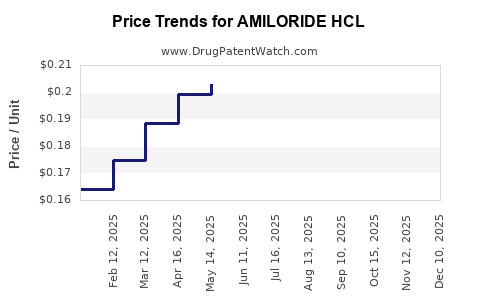 • Short-term (1–2 years): Prices for generic amiloride are expected to decline modestly by 5–10% due to increased competition and patent expirations, stabilizing around $0.08–$0.12 per tablet.
