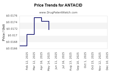 Analysis of historical data indicates that innovative branded antacids command premium prices, often exceeding USD 10–15 per bottle or pack. Generic formulations, however, have seen prices decline substantially post-patent expiry, with some generics available at below USD 2 for equivalent doses.