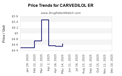 The carvedilol ER market is primarily characterized by declining prices driven by generic competition and patent expiries, but sustained demand exists owing to its clinical utility in managing pervasive cardiovascular conditions. While branded prices are forecast to decline significantly in the short term, innovative formulations and expanding indications could introduce premium pricing opportunities. Stakeholders should navigate the dynamically evolving landscape, balancing the benefits of cost-effective generics against the potential for technological innovation to sustain premium market segments.
