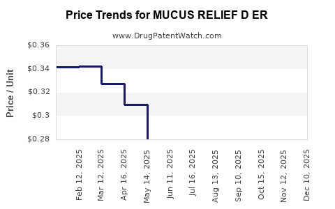 As of Q1 2023, oral Mucus Relief D ER’s retail prices ranged from USD 8 to USD 15 for a bottle containing 20–30 extended-release tablets, variably priced across retail outlets and regions. Generic equivalents are priced approximately 20–40% lower, intensifying market competition [2].