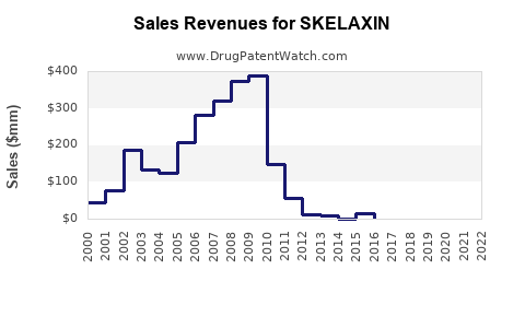 Historically, SKELAXIN generated modest but stable revenue streams, driven largely by its broad off-patent status and consistent prescribing in emergency and outpatient settings. The introduction of generics saw immediate revenue declines, with revenues stabilizing at lower levels.