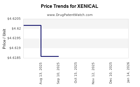 Xenical faces competition from newer drugs such as Qsymia (phentermine/topiramate), Saxenda (liraglutide), and Wegovy (semaglutide), which offer enhanced efficacy or different mechanisms. Additionally, over-the-counter availability of orlistat in some markets (e.g., Alli in the U.S., lower-dose version of Xenical) expands accessibility but compresses premium pricing opportunities.